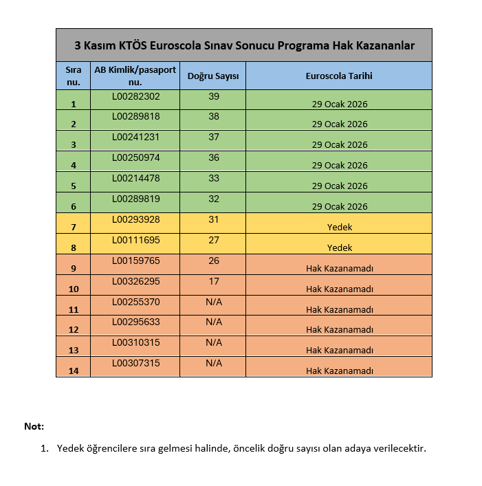 29 Ocak 2026’da Avrupa Parlamentosu organizasyonu ile KTÖS ve KTOEÖS sorumluluğunda gerçekleşecek olan Euroscola Programı’nda yer almaya hak kazanan öğrenciler, KTÖS’te yapılan EuroQuiz sınavı ile belirlendi. Tam listeye aşağıda yer verilmiştir. Sınava katılan tüm öğrencileri tebrik ederiz.